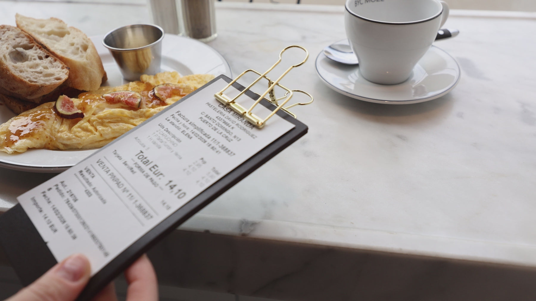 Leather check presenter made from thick Italian leather for daily hospitality use. Its slim, structured design features a metal binder clip that securely holds bills, cash, or receipts during service. Logo debossing or engraving is available, making it a clean branded detail for restaurants, cafés, and bars.