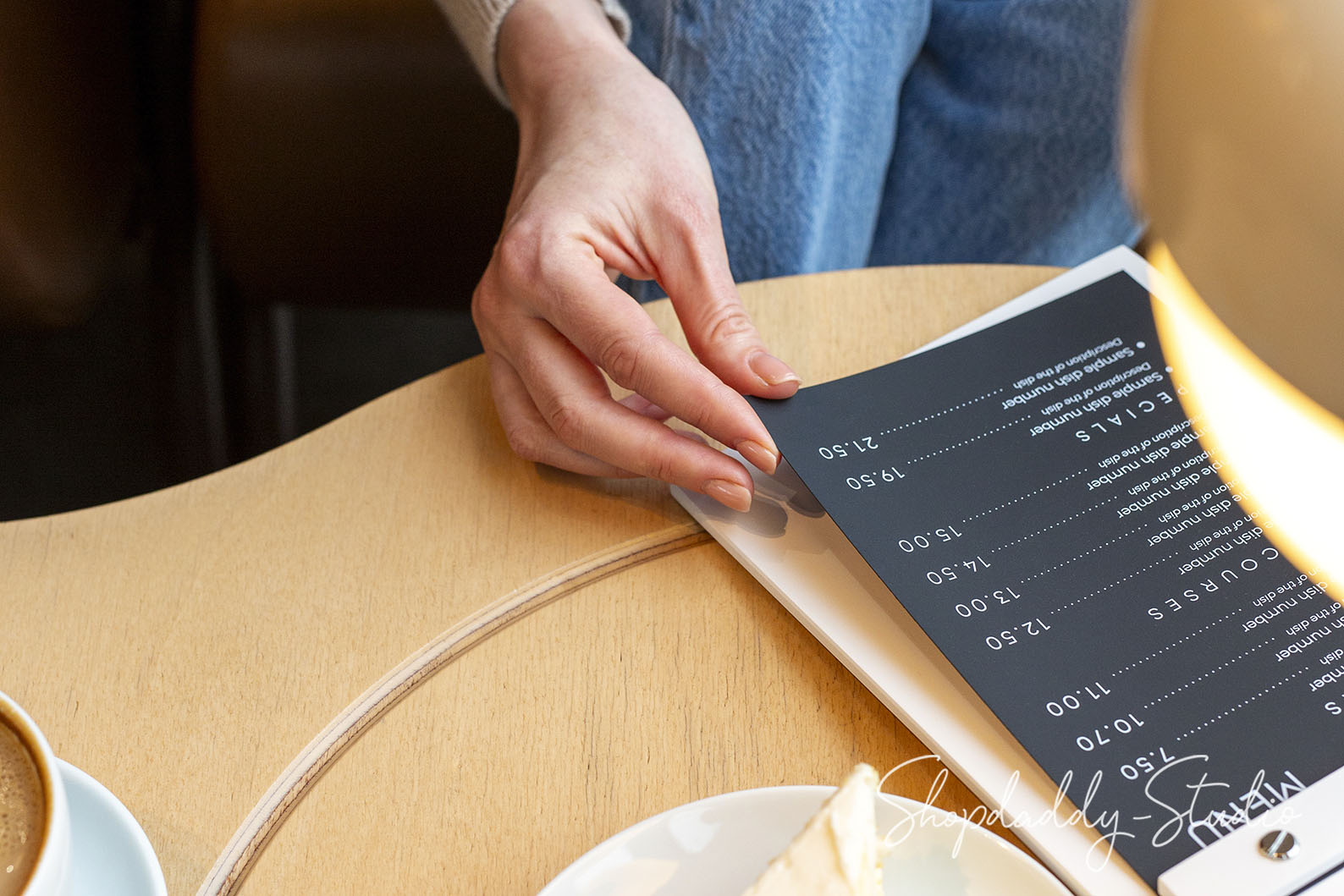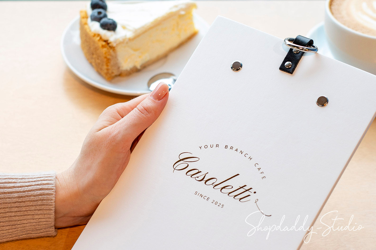 This beautiful, custom, vintage-looking menu holder is perfect for your cafe, bar, restaurant, or any event. The menu board is made of selected wood with leather elements and durable metal accessories. You can cleverly organize the space in your cafe by hanging the wooden menu holders on a wall using the metal ring. Use the best for your business and let customers touch your brand.
