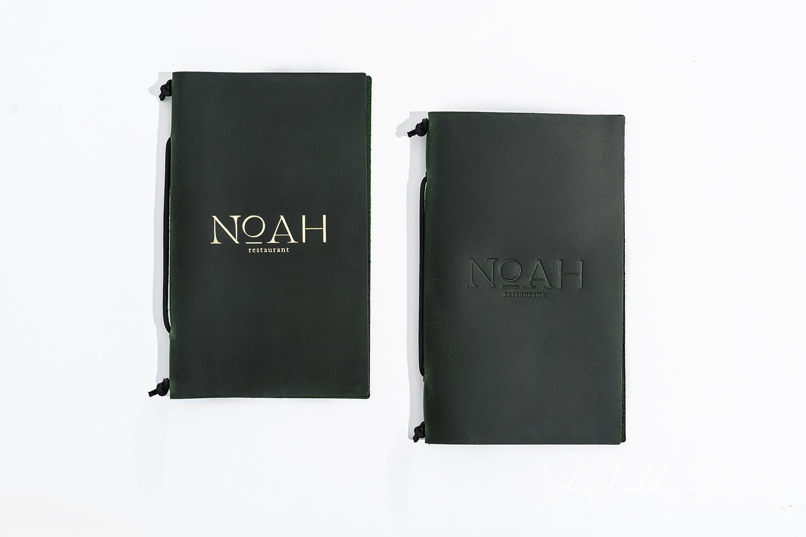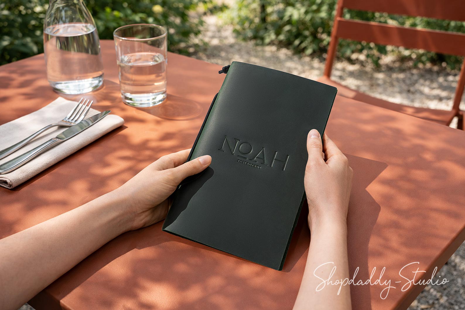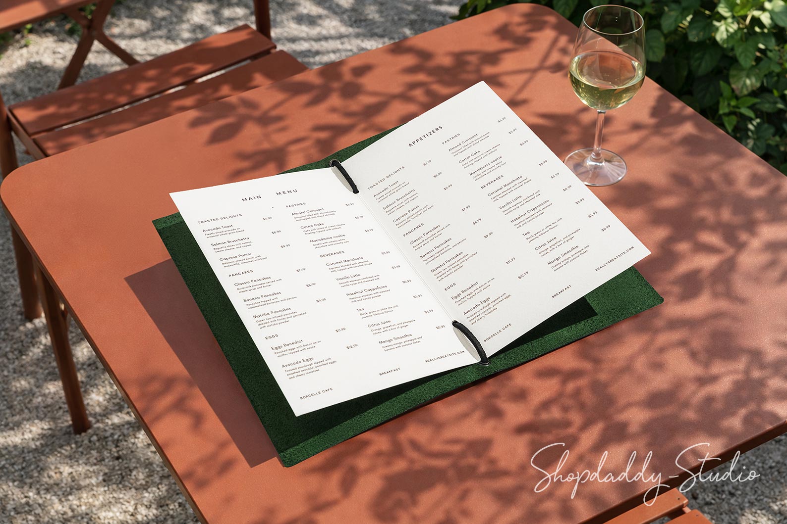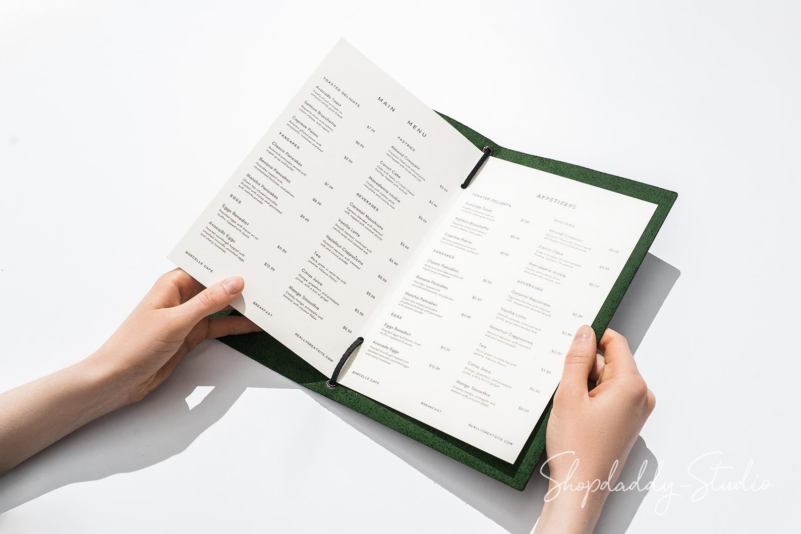 On the photo: 8.5 × 5.5" leather menu cover (Green color)