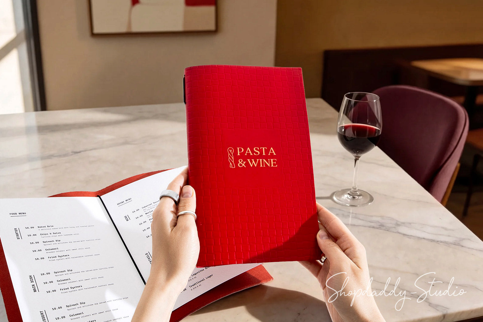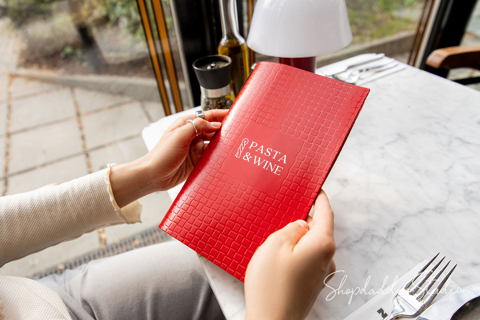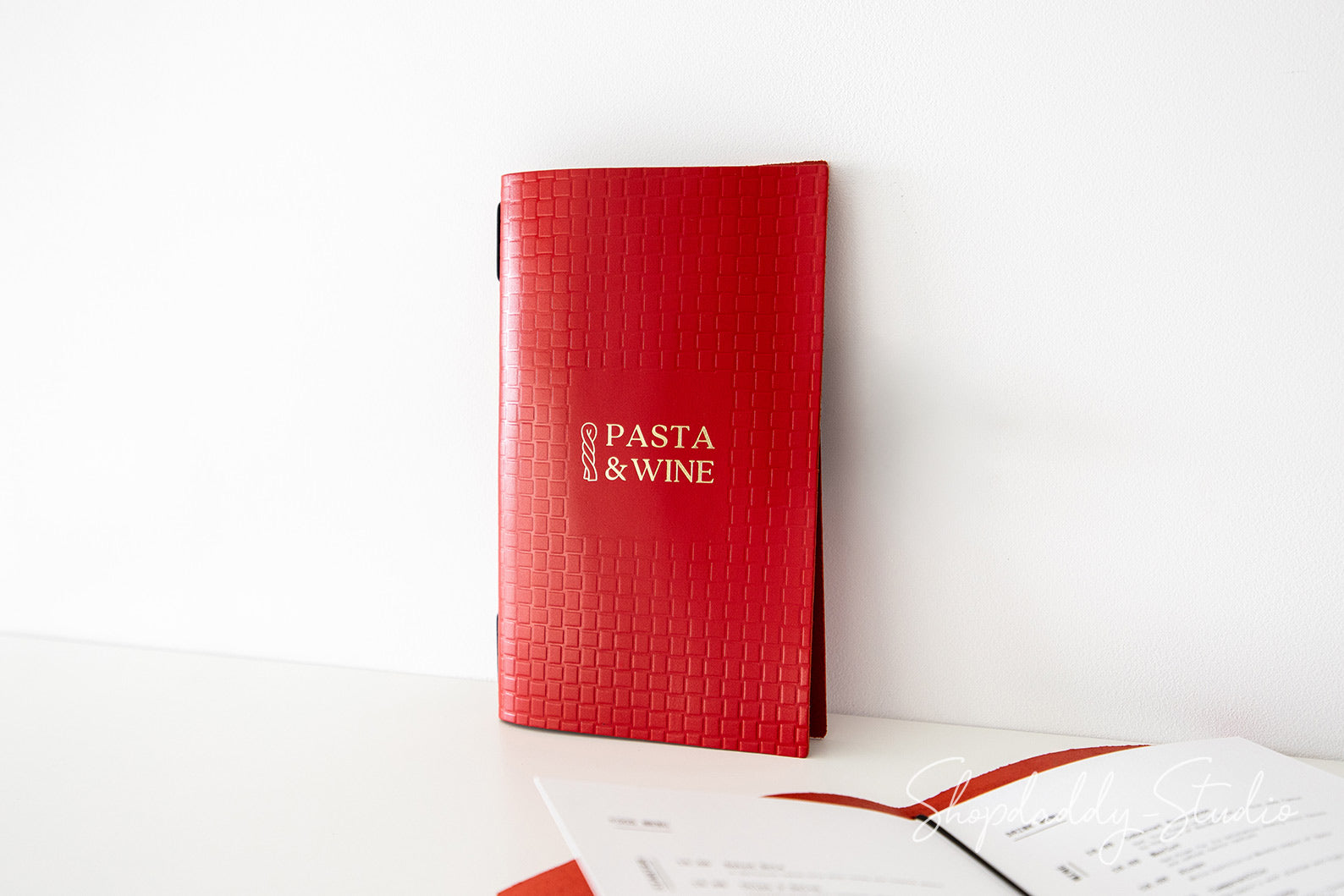 On the photo: 8.5 × 5.5" leather menu cover (Red color)