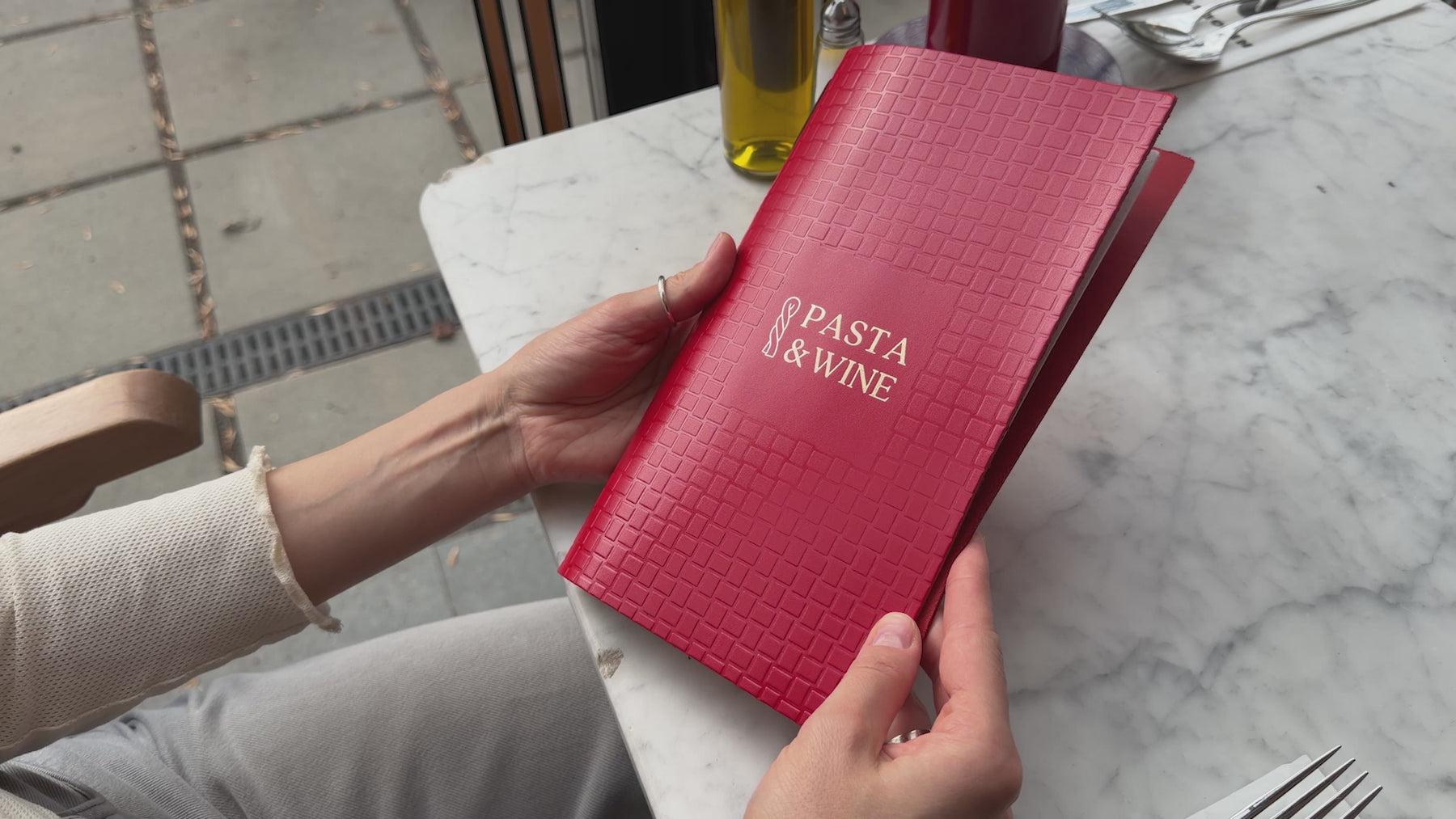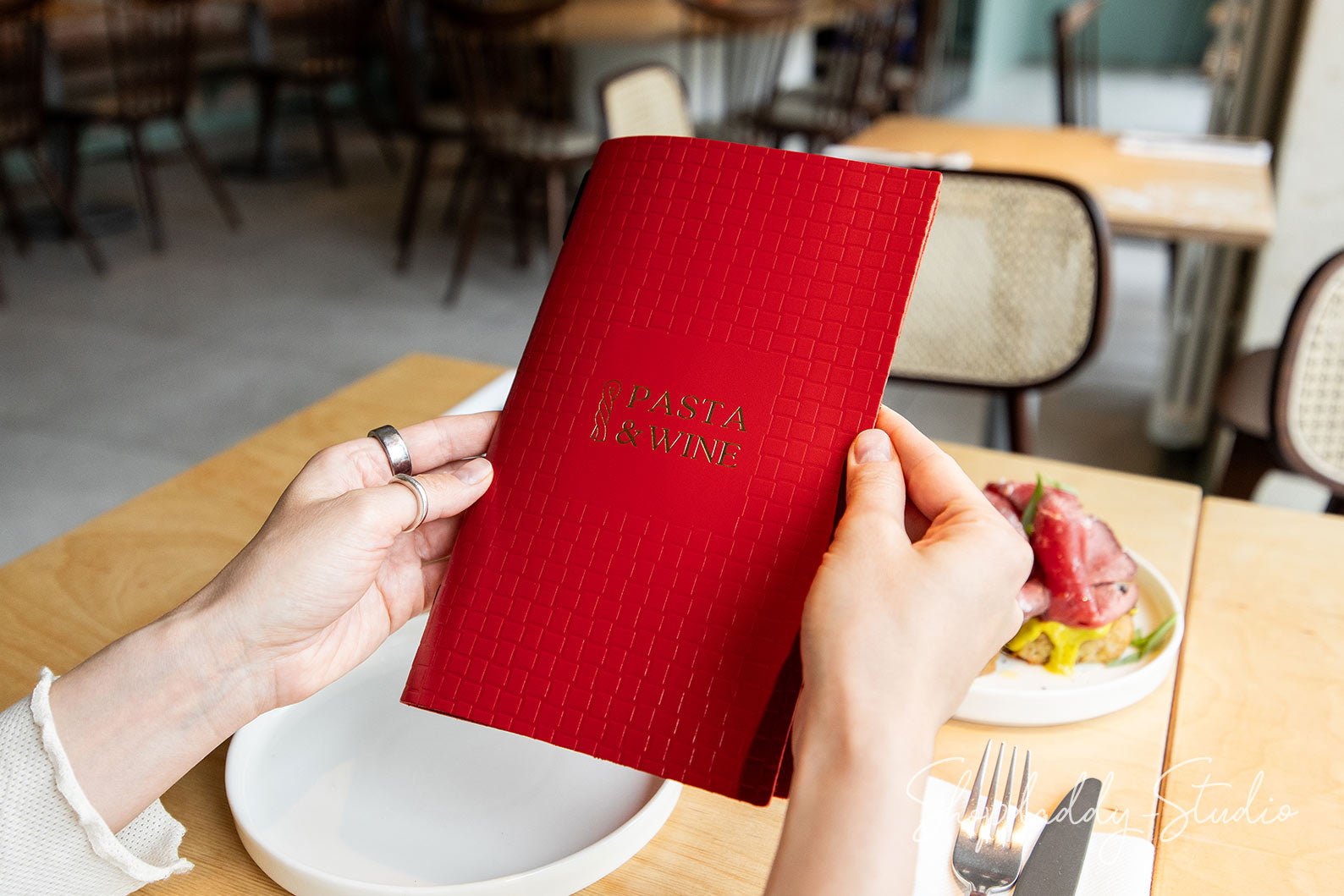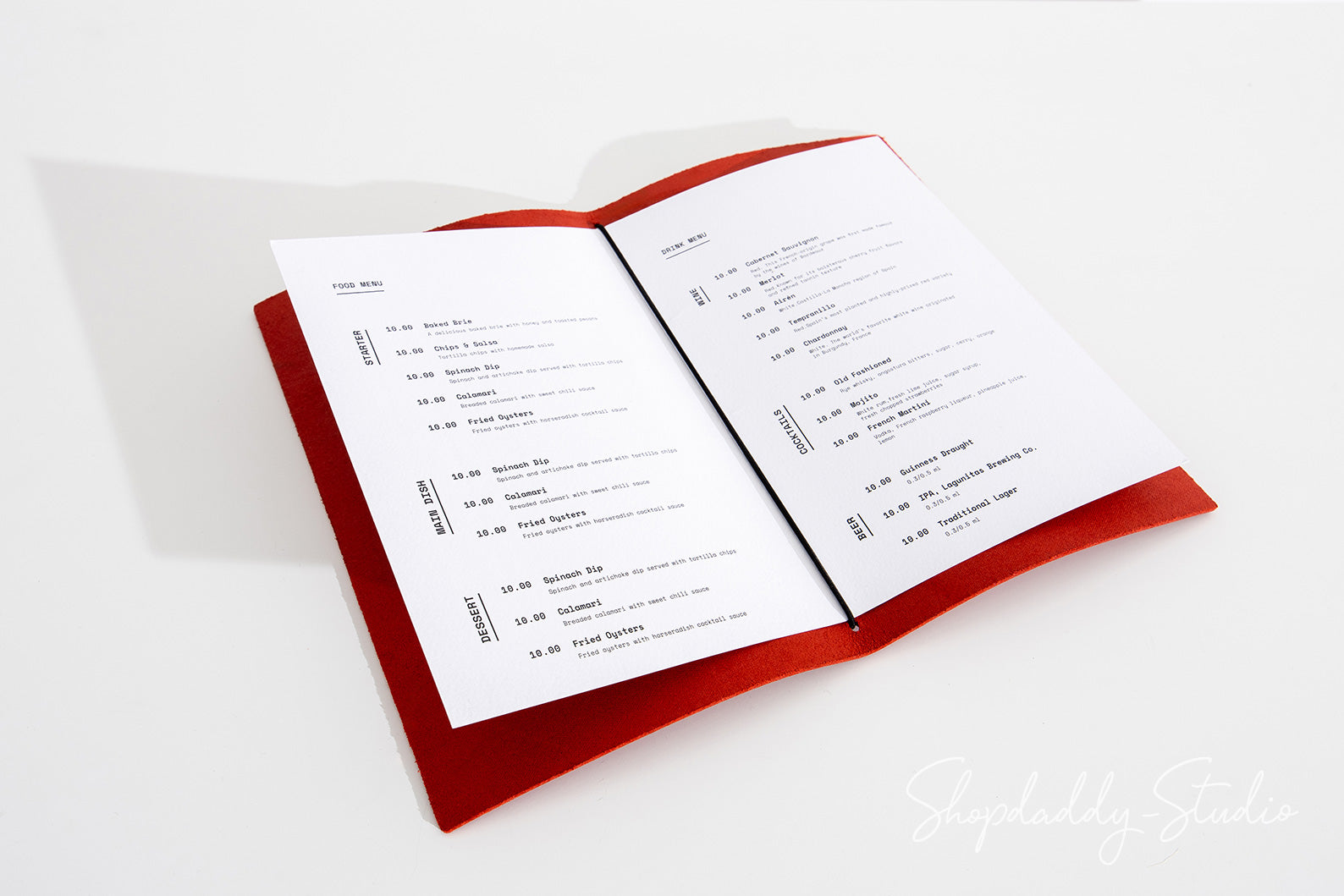 On the photo: 8.5 × 5.5" leather menu cover (Red color)