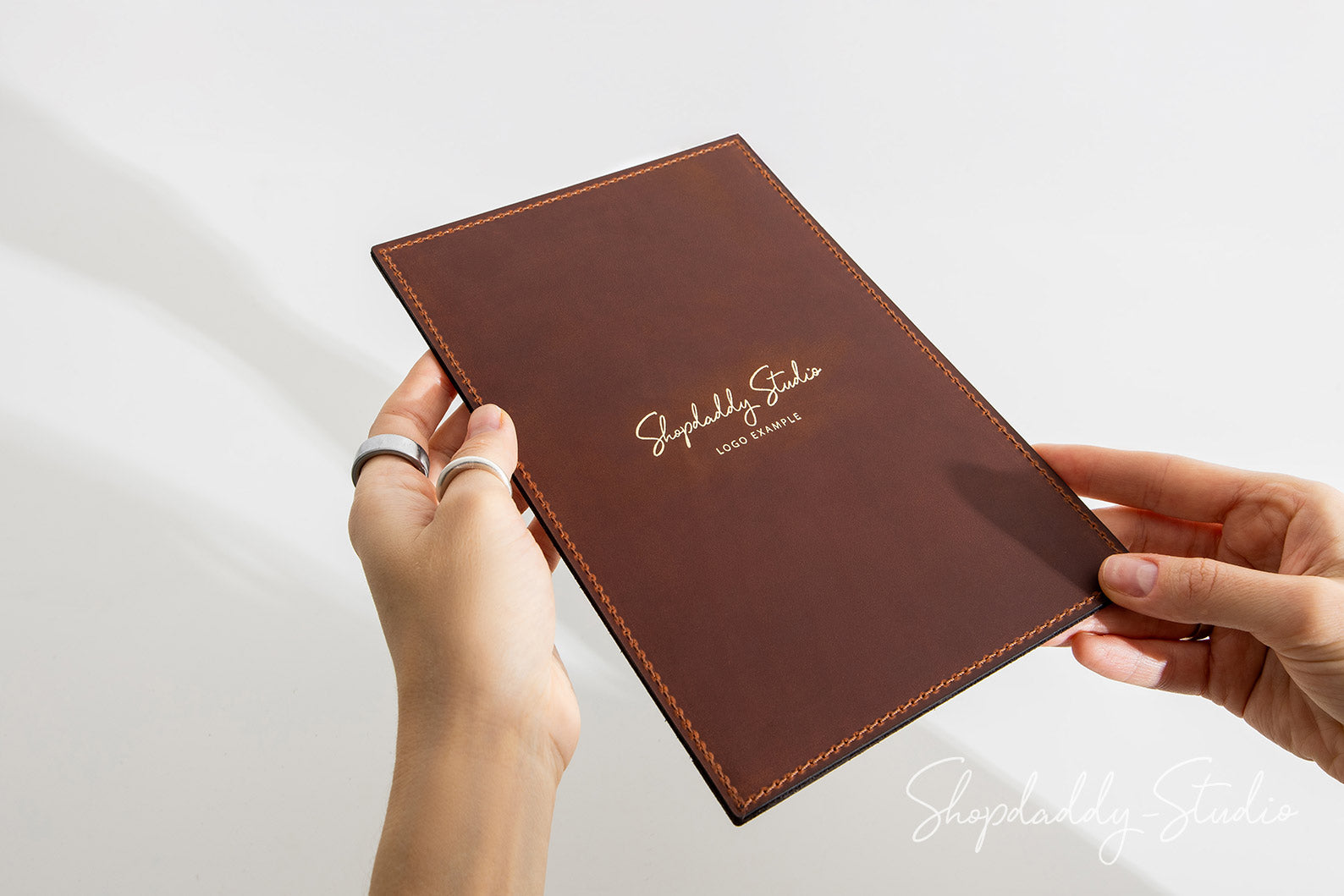 Custom Leather Menu Holder made from genuine Crazy Horse leather, valued for its durability and ability to develop a distinctive natural patina over time. Designed with two leather pockets at the top and bottom, it securely holds a single menu sheet and allows quick replacement during service. An ideal solution for presenting a one-page restaurant menu in a clean and structured way, with optional logo personalization for branded table settings.