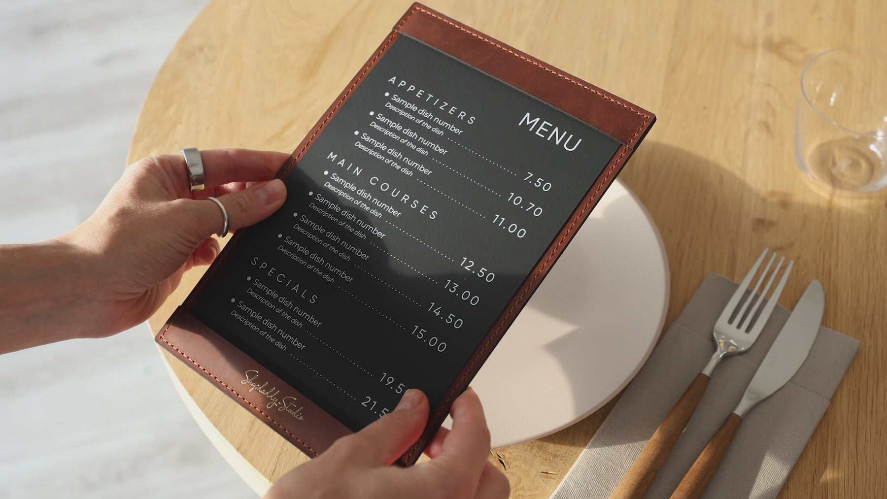 - You can choose the menu cover size by selecting from the "For Paper Menu Size" option (for 8.5x5,5'' paper menu size on the photos). Please, contact us if you need another custom size.