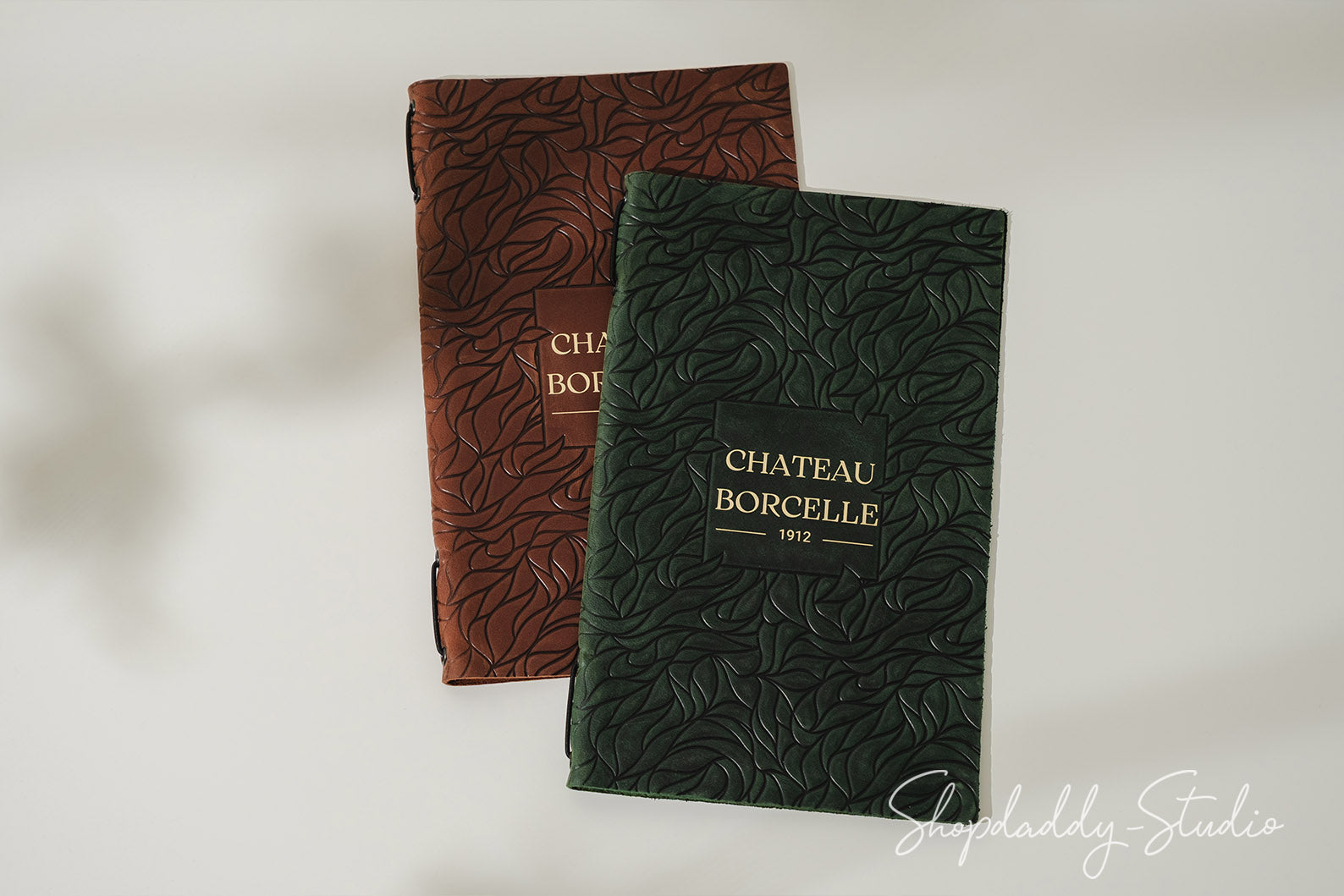 This leather menu cover combines timeless craftsmanship with a subtle leaf-pattern embossing, adding a natural and refined touch to your presentation. Designed for paper menus folded in half, it features an elastic band for quick page changes. Available in various leather colors, the cover can be personalized with your logo for a professional branded look — ideal for restaurants, cafés, and bars.