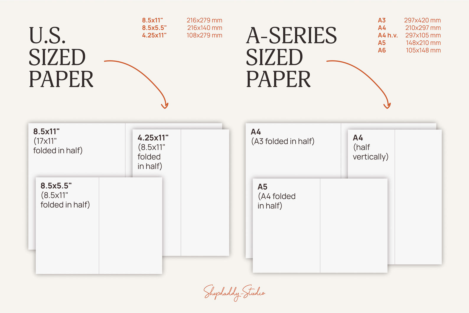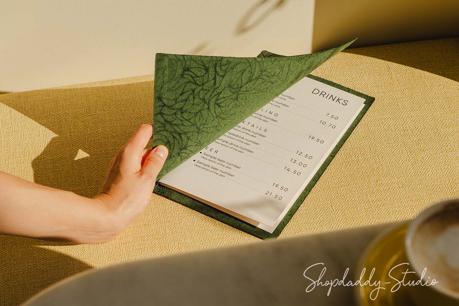 • The menu book can be made for paper menu sizes: 8.5x5.5" (8.5x11" folded in half) and A5 (A4 Folded in Half)