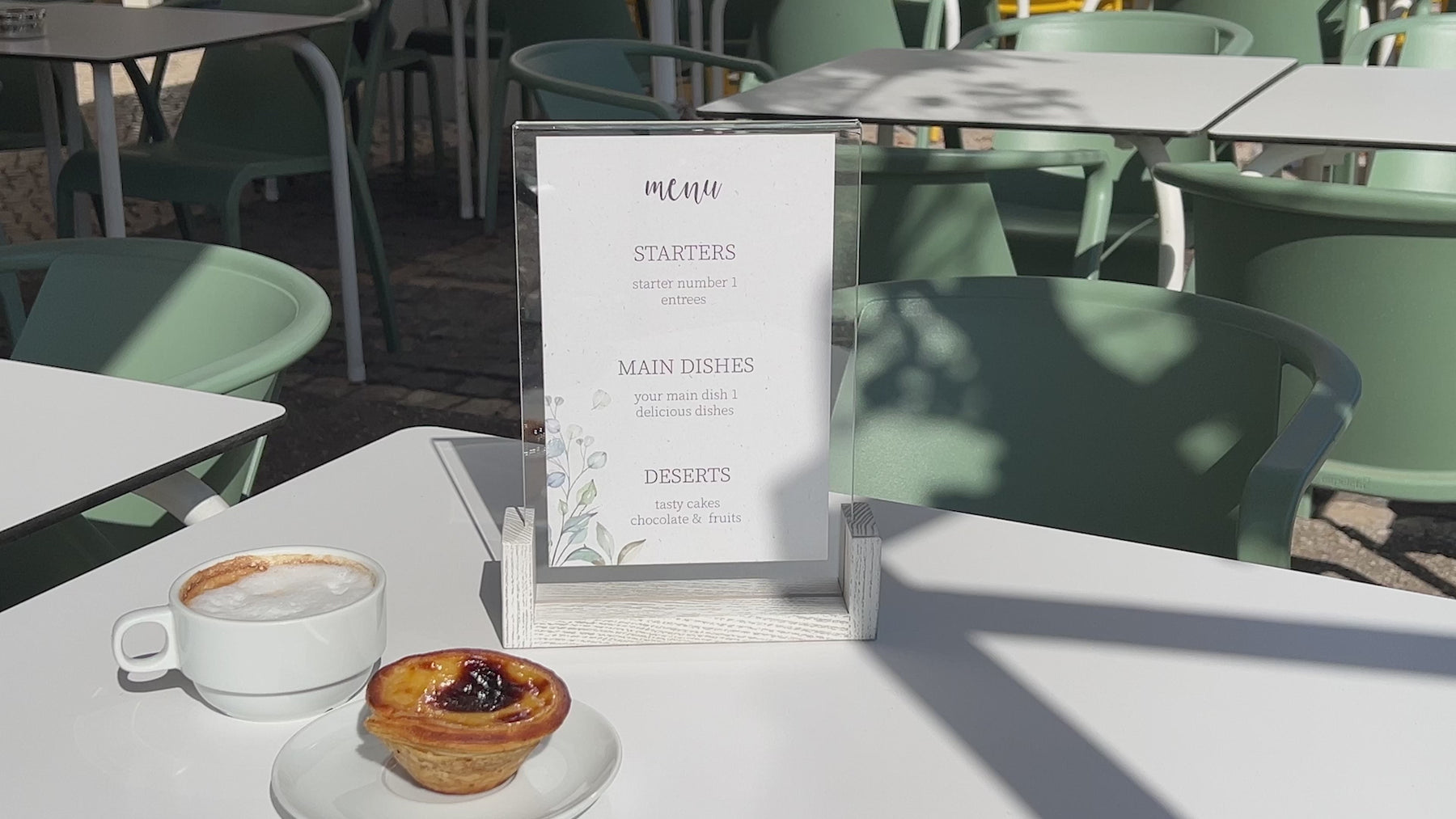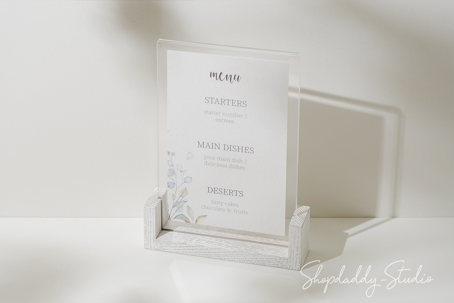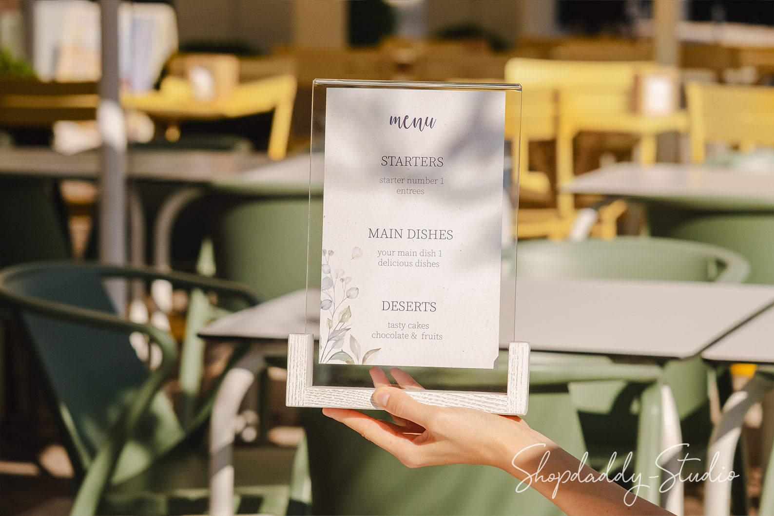 The new vision of the table menu stands. It's about sustainability and aesthetics. This contactless holder combines these functions. Textural, solid natural ashwood, and invisible acrylic board as counterweight assembly. Simple geometry is central to our menu holder's design. We kept the easy way to insert menu cards in the "sleeve" without disassembling the acrylic board. The sign holder also works well for displaying the QR code with your digital menu so that customers can view it on their smartphones.